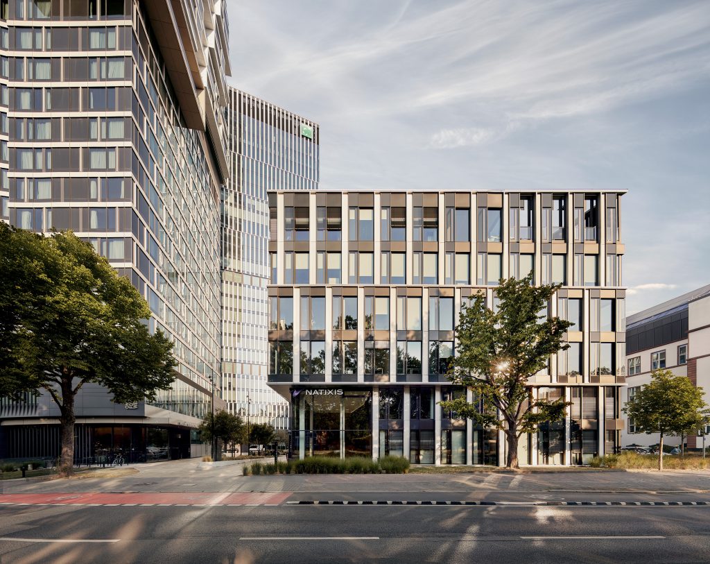 Der sechsgeschossige Business-Solitär ermöglicht den Mietern eine individuelle Nutzung der Flächen. Das Bürohaus in besonders guter Lage wurde vom Architekturbüro Cyrus Moser entworfen – als freistehendes Eckgebäude mit guter Sichtbarkeit und enormer Wirkung im Gesamtgefüge. Im obersten Stockwerk lädt eine Terrasse mit bestem Blick auf die Frankfurter Skyline.